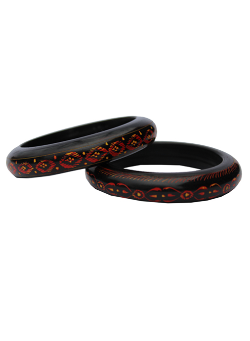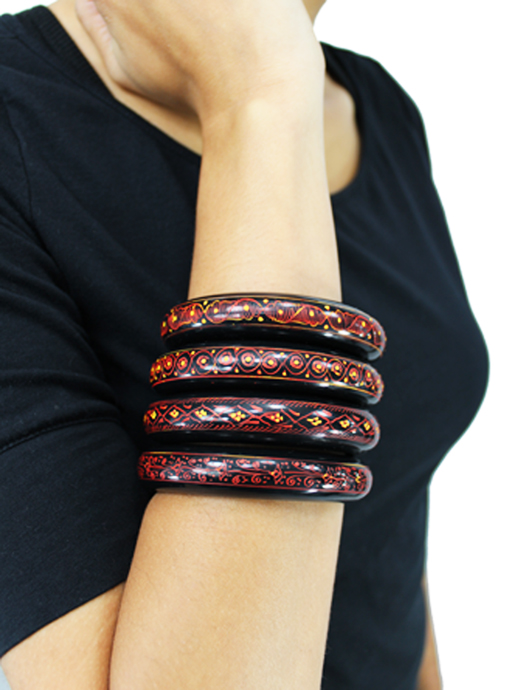 These beautifully hand etched lacquer bangles will add instant drama to your look day into night.