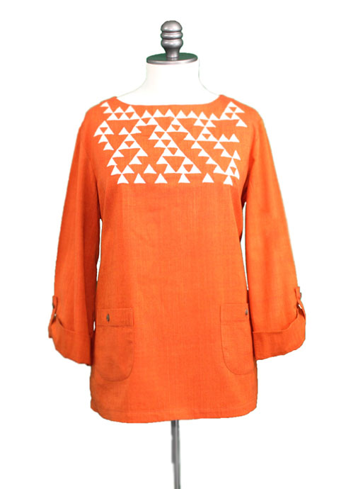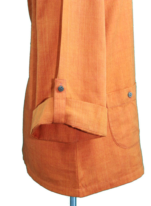 Hand woven top with round neckline, 3/4 sleeves and fold over tabs, front pockets and coconut buttons.