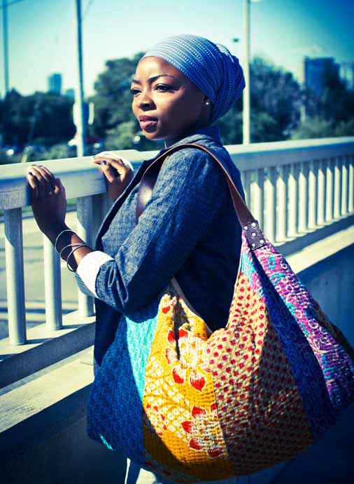 Recycled saree with reinforced leather details.