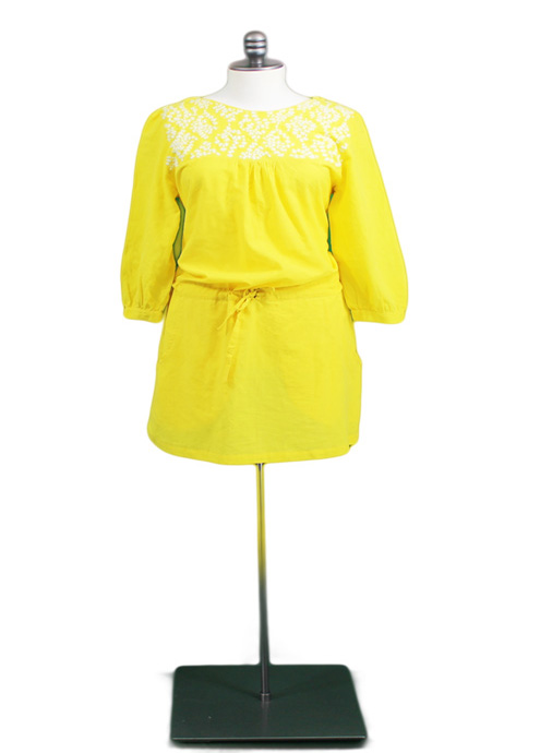 Hand woven dress with round neckline, covered buttons, 3/4 sleeves, drawstring drop waist and large front pockets.