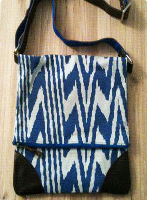 Hand screen printed purse with bold Ikat pattern, adjustable leather strap, zipper closure and inside pocket.
