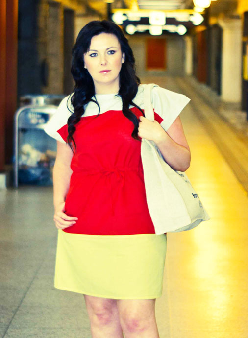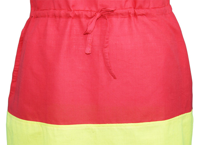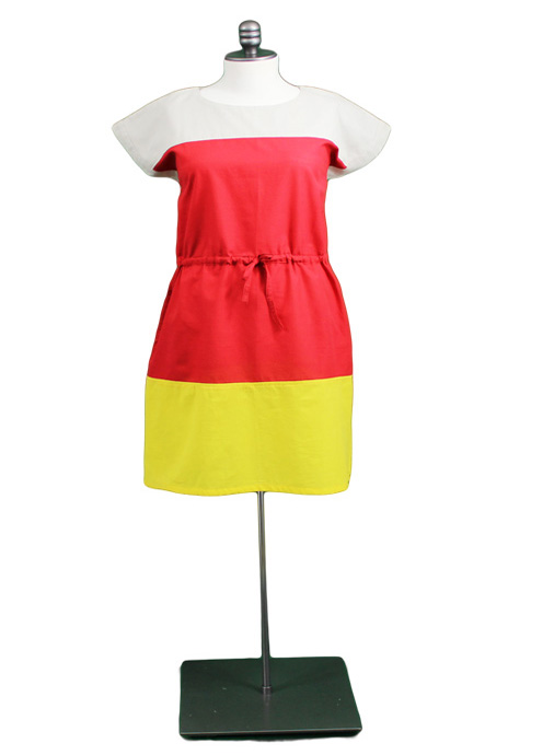 Hand woven colour blocked dress with round neckline, drawstring waist and wide cap sleeves.