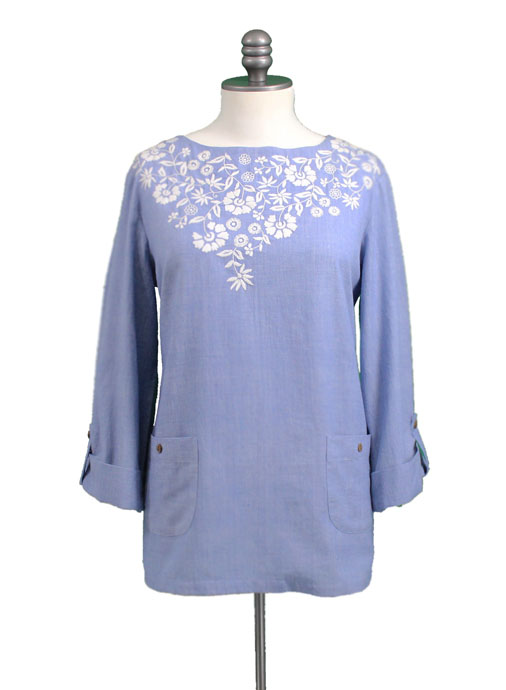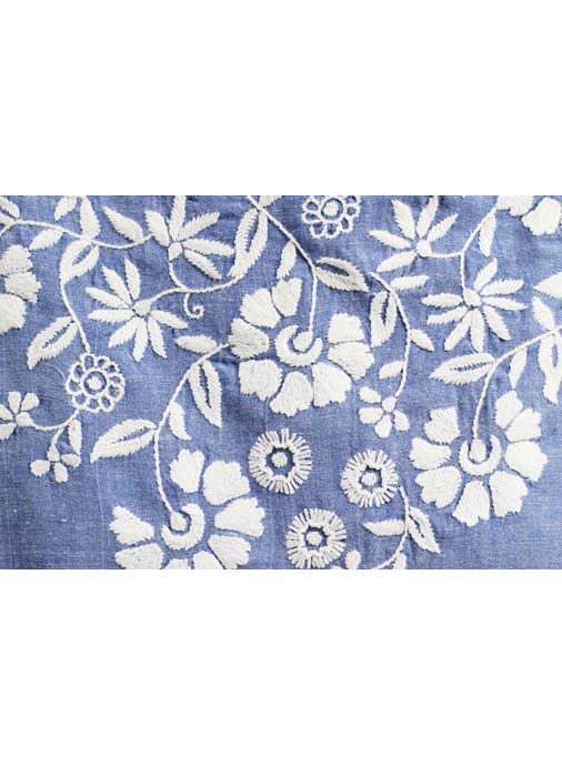 Blue chambray with white hand embroidery.