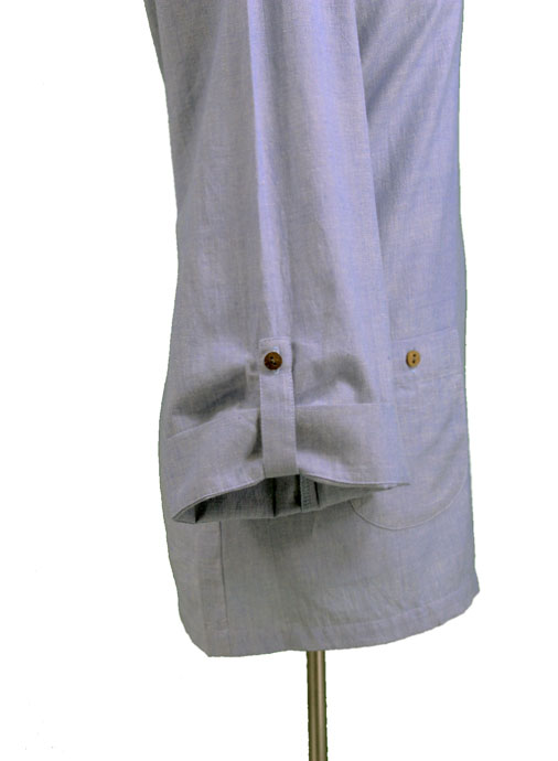 Hand woven top with round neckline, 3/4 sleeves and fold over tabs, front pockets and coconut buttons.