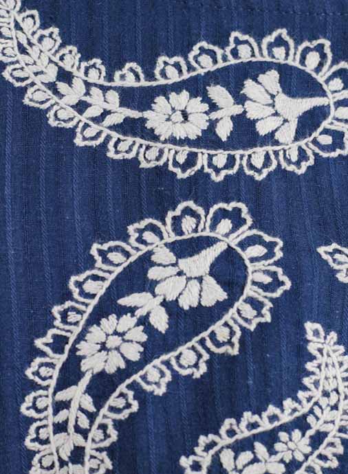 Olympian blue self-stripe with white hand embroidery.