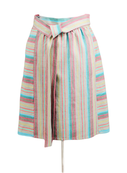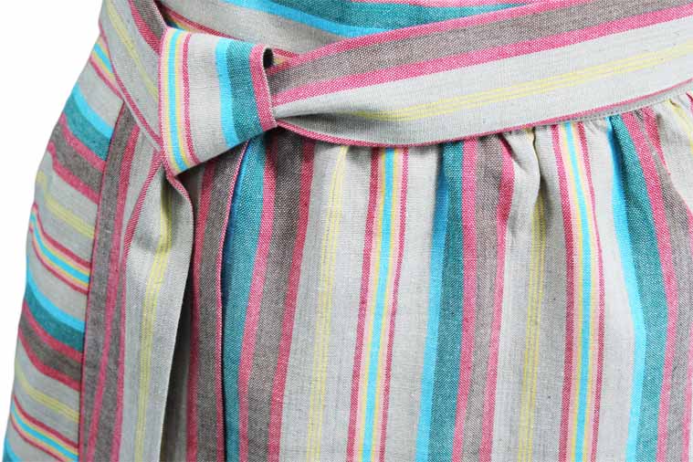 Hand woven skirt with belted tie waist, elastisized back waist and side pockets.