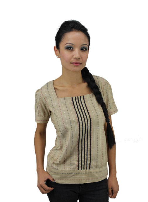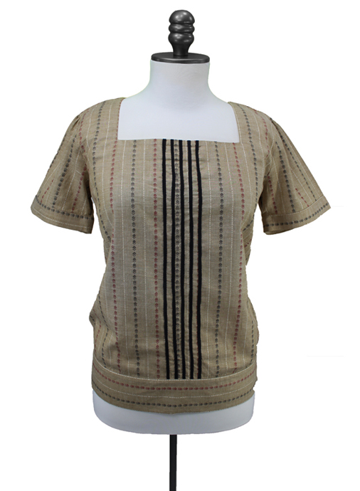 Hand woven top with short sleeves, black ribbon detailing and covered buttons at drop waistband